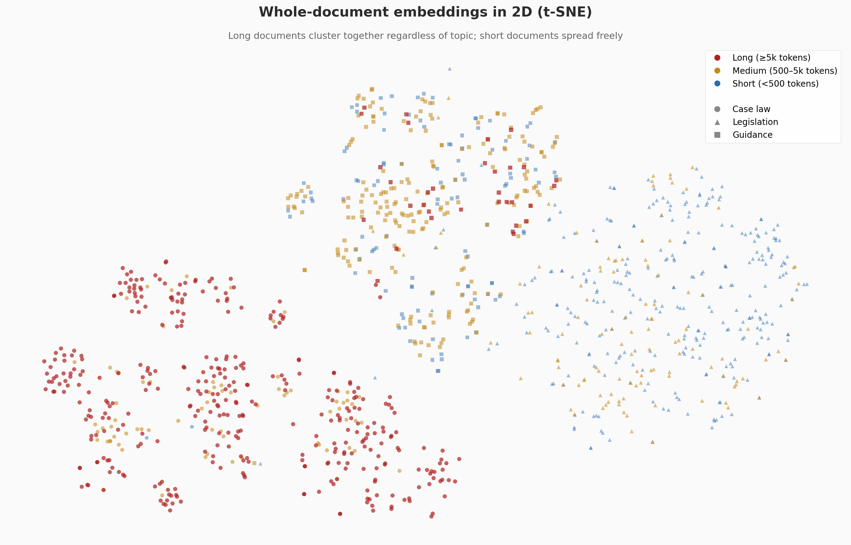 If these long documents were being embedded by topic, you'd expect to see multiple distinct clusters of red dots spread across the space, i.e. one cluster for disrepair cases, another for eviction cases, another for rent repayment, and so on. Instead, they're concentrated in a single region and the embeddings are grouping by the fact that the document is a long, multi-topic legal document. If you look closely at the shapes, you'll notice that the few long documents (red) that do sit elsewhere are triangles and squares (legislation and guidance), which tend to be topically focused even when they're long. The case law circles don't get that luxury, as each decision spans multiple legal topics, and the embedding has no choice but to average them all into the same part of the space.