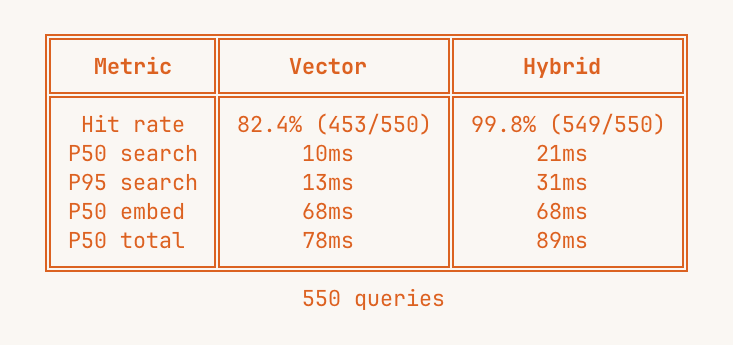 Performance-wise, the hybrid search runs at ~13ms P50 for the query itself, and even factoring in embedding latency the full round-trip sits at ~88ms P50, which was all achieved running on the same Postgres instance we already had.